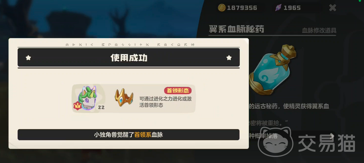 当白金独角兽同时满足两项条件后,进入进化准备阶段。关键操作在于:需手动进入精灵背包,将其当前装备的强化术替换为“进化之力”。该步骤不可跳过——唯有在战斗中激活该强化术,再结合首领血脉的内在属性,才能在特定战斗条件下(如回合开始、技能命中或胜利结算时)正式触发进化动画,完成向异色炫彩独角兽的形态跃迁。