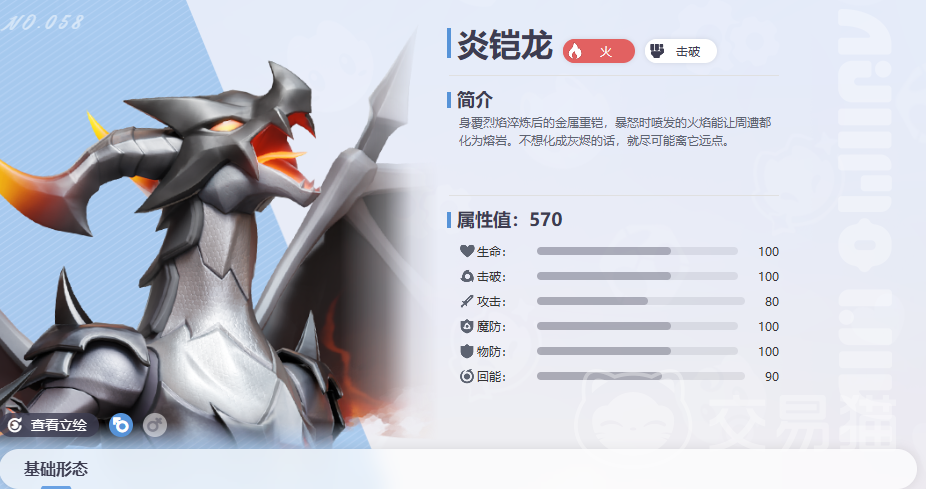 炎铠龙为全系列进化段数最多、种族值总和最高的武伊莫单位,各项基础属性分布高度均衡,兼具高生存容错与持续压制能力,视觉呈现亦契合顶级BOSS级角色设定。其高颜值与高实用性并存的特点,使其成为PVE与高难副本中的常驻主力选择。