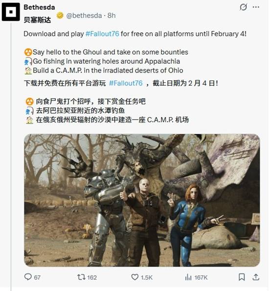 贝塞斯达宣布,网络角色扮演动作游戏《辐射76》(Fallout76)现已开启限时免费。所有玩家均可在PC端以及PlayStation和Xbox主机上体验该游戏。此次免费活动将持续至北京时间2月6日01:00