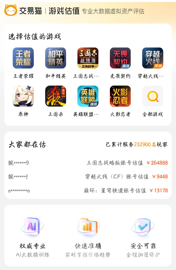 本期小编给大家带来和平精英账号估价内容的分享,很多小伙伴都不知道自己的账号价值多少钱,那么本期小编就给大家带来一个可以帮助大家快速估值自己账号价格的应用——,是当下最好用的交易平台,不仅安全靠谱,还拥有超多游戏交易专区,买家和卖家都非常多,后续大家哪怕想要购买一个符合自己喜好的账号都能快速找到。