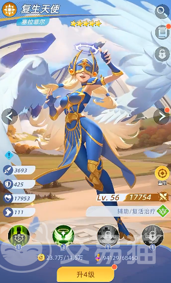 第三位关键角色为复生天使,是全游戏中唯一拥有团队复活能力的辅助单位。其核心价值体现在三层维度:一是前排承伤与治疗续航;二是施放复活技能后,为目标附加护盾并提供全队双项基础属性增益(如攻击力与防御力);三是在关键节点挽救核心输出角色,大幅缓解后排生存压力。该角色泛用性极强,从前期开荒到后期高难副本均可稳定发挥作用,且所有增益效果均基于常态属性触发,无需复杂条件即可生效。作为兼具功能性、稳定性与不可替代性的战略级辅助,复生天使可全程贯穿玩家整个养成周期。