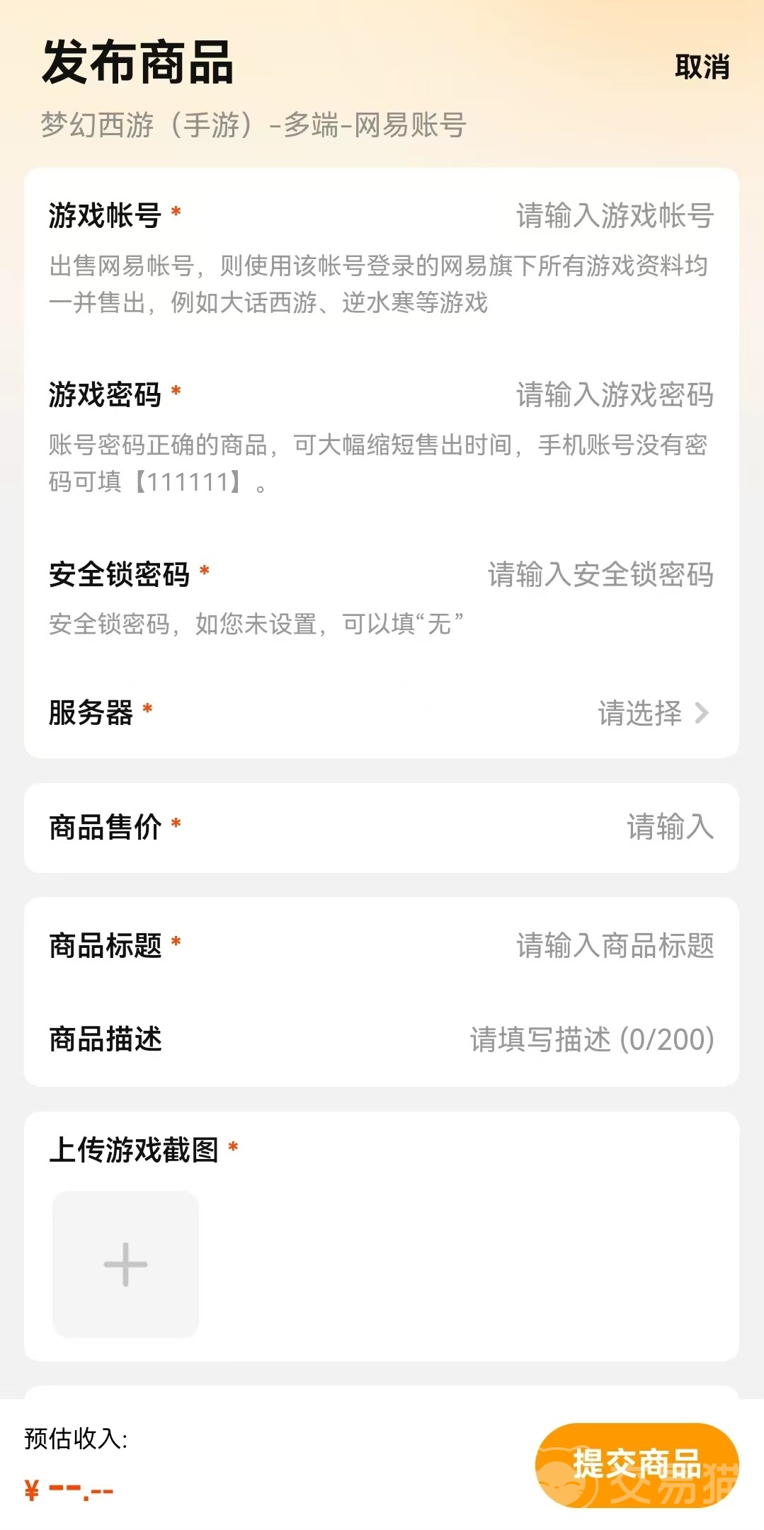 覆盖的游戏范围非常广泛,无论大家想要进行梦幻西游的手游还是端游交易,在这里都可以直接搜索专区,接下来小编以手游为例给大家再进行详细介绍。如果想要卖账号,直接点击卖账号功能在这里找到梦幻西游手游之后,直接通过简单填写方式完成发布。设置了一个非常好的模板,可以介绍等级、角色、门派、综合实力、召唤兽评分等,这样就将账号中最有价值的部分直接展现出来。不需要再进行其他方面的编辑,将模板填写完整后直接就能上架。上架之后因为人气非常高,所以很快就能够收获大量流量,只要价格合理,很快就能够出售出去。成品号采用的是平台发货模式,整个过程又快又安全,发货完成后,1~3天就能直接收到打款。