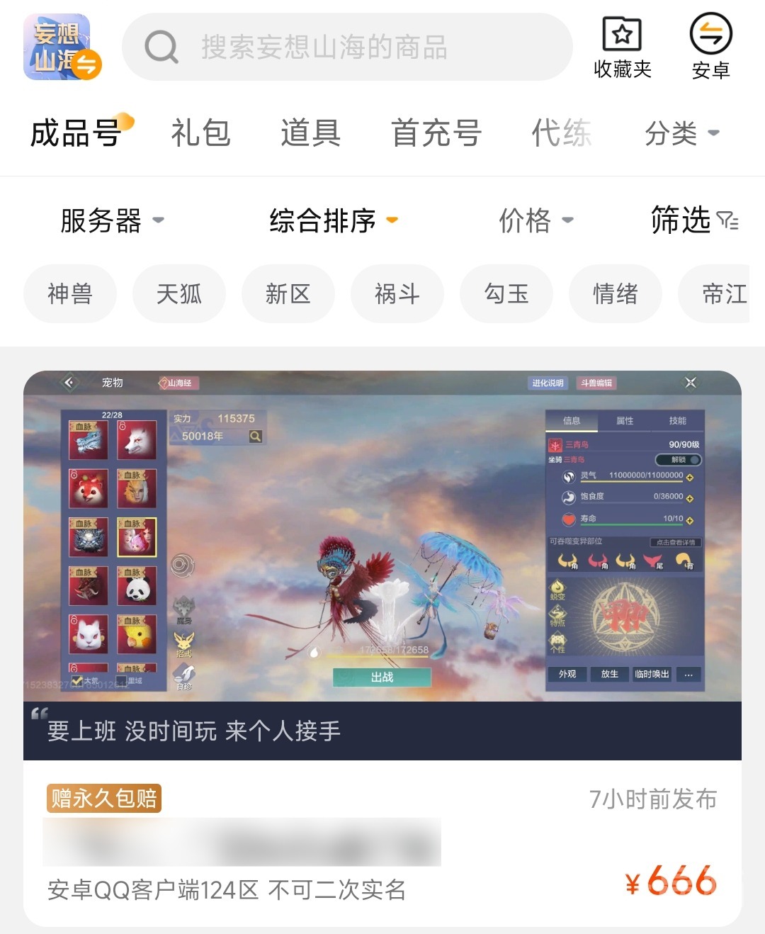扫码下载APP 下载 点击下载APP 对于安卓用户而言,直接通过链接就能下载到app,苹果用户的话直接用浏览器打开的官网即可,两个端口获得的服务内容都是一样的。想要进行妄想山海这款游戏账号的交易,就要选择大平台。 这个平台的注册用户已经超过一亿的体量,平台上的支持的游戏6000 ,基本上实现了全覆盖,在售游戏账号数量超过100万 ,累计已服务了7000万 的用户。