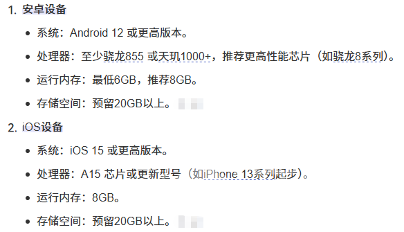 iOS平台建议:系统版本不低于iOS 15;芯片需搭载Apple A15或更高级别(如A16、A17 Pro等);运行内存不低于8GB;可用存储空间不少于20GB。