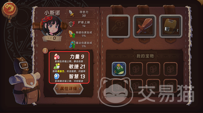 进入旅馆大厅后,玩家即可接触完整的角色成长路径。所有可操作角色均支持通过武器、法术、宝物三大系统进行能力强化。其核心属性统一划分为敏捷、力量、智慧三类,每名角色仅能选定其中一项作为主属性——该属性将获得最高倍率的攻击力加成,直接决定角色输出风格与后期成型方向。以小斯诺为例,若将其主属性设定为敏捷,不仅可提升攻击速度与闪避率的百分比数值,还将同步增强基础攻击效果,形成高速高频的战斗节奏。
