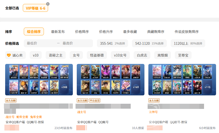 若是大家在游戏当中将个人账号充到V6,需要消耗1000元,而在里购买到一个达到V6的账号,往往只需要花费百元就可以到手, 运气好的情况下,甚至几十元大家都可以蹲到,而且在平台上找起来也是比较快速的,大家只需要在VIP等级处输入等级进行筛选即可。