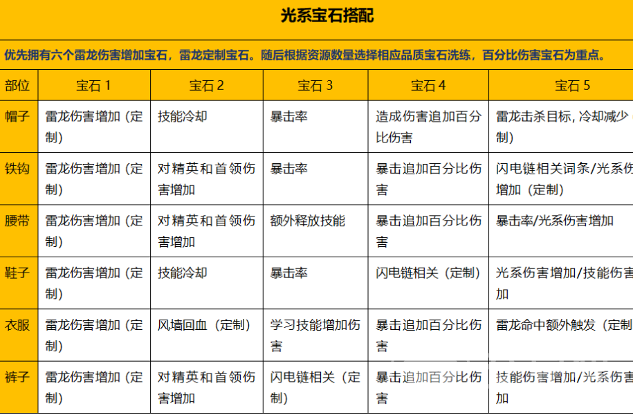 光系配装以雷龙为核心输出单元,首要任务是集齐六枚【雷龙伤害增加】定制宝石。该套装为光系输出的根基,缺失任一都将显著削弱技能倍率上限。在此基础上,头部与足部需强制锁定【技能冷却】与【暴击率】词条——前者缩短雷龙释放间隔,保障连招节奏;后者提升暴击触发频率,确保伤害曲线平稳。护腕与腰带位置则主攻【对精英首领伤害增加】,该词条在面对高血量、高抗性目标时效果显著,是攻坚副本的关键增益。衣装部位推荐选择【风墙回血】,弥补光系职业生存短板,增强战斗容错能力。