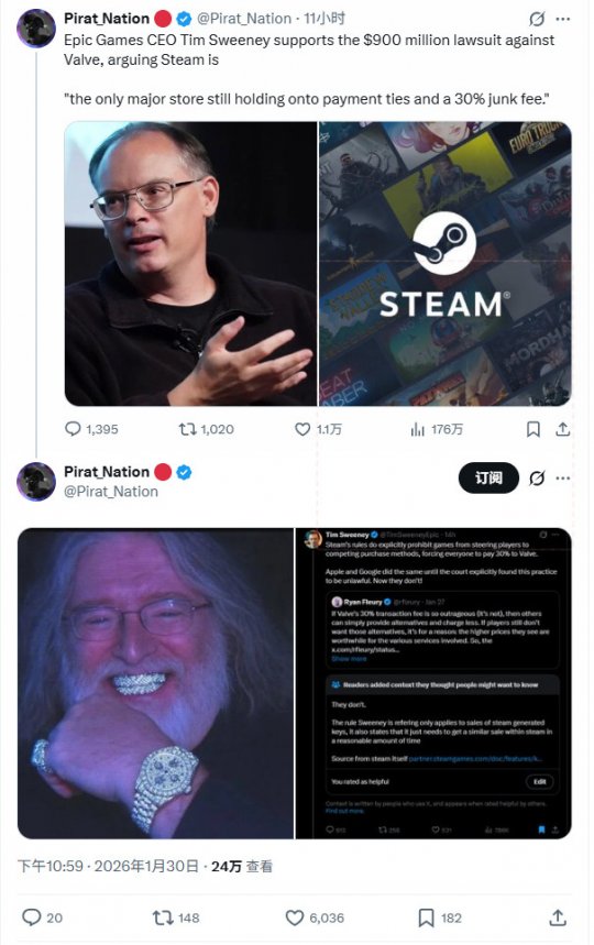 英国针对V社高达9亿美元诉讼近日获得竞争上诉法庭批准,将以集体诉讼形式继续推进。Epic Games CEO、同时也是Steam长期批评者的Tim Sweeney随即发声支持对V社的诉讼,他认为案件指控“站得住脚”。