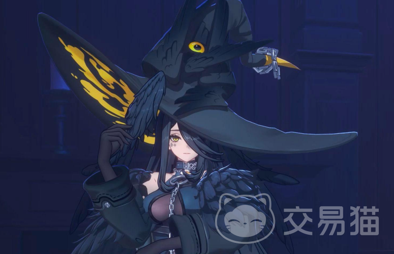 黑羽的整体造型融合了哥特式魔幻美学与鸦类图腾意象:头部佩戴一顶由活体乌鸦幻化而成的礼帽,双臂覆有流动光泽的黑色羽翼,颈部佩戴嵌有乌鸦瞳孔纹样的金属项圈,神情沉静而疏离。她首次登场于“魔女之屋”场景,初始形态为非人形的拟态存在——仅以一顶可交互的帽子形式出现,玩家可通过与其对话触发占卜类互动事件,由此开启对角色背景的初步探索。