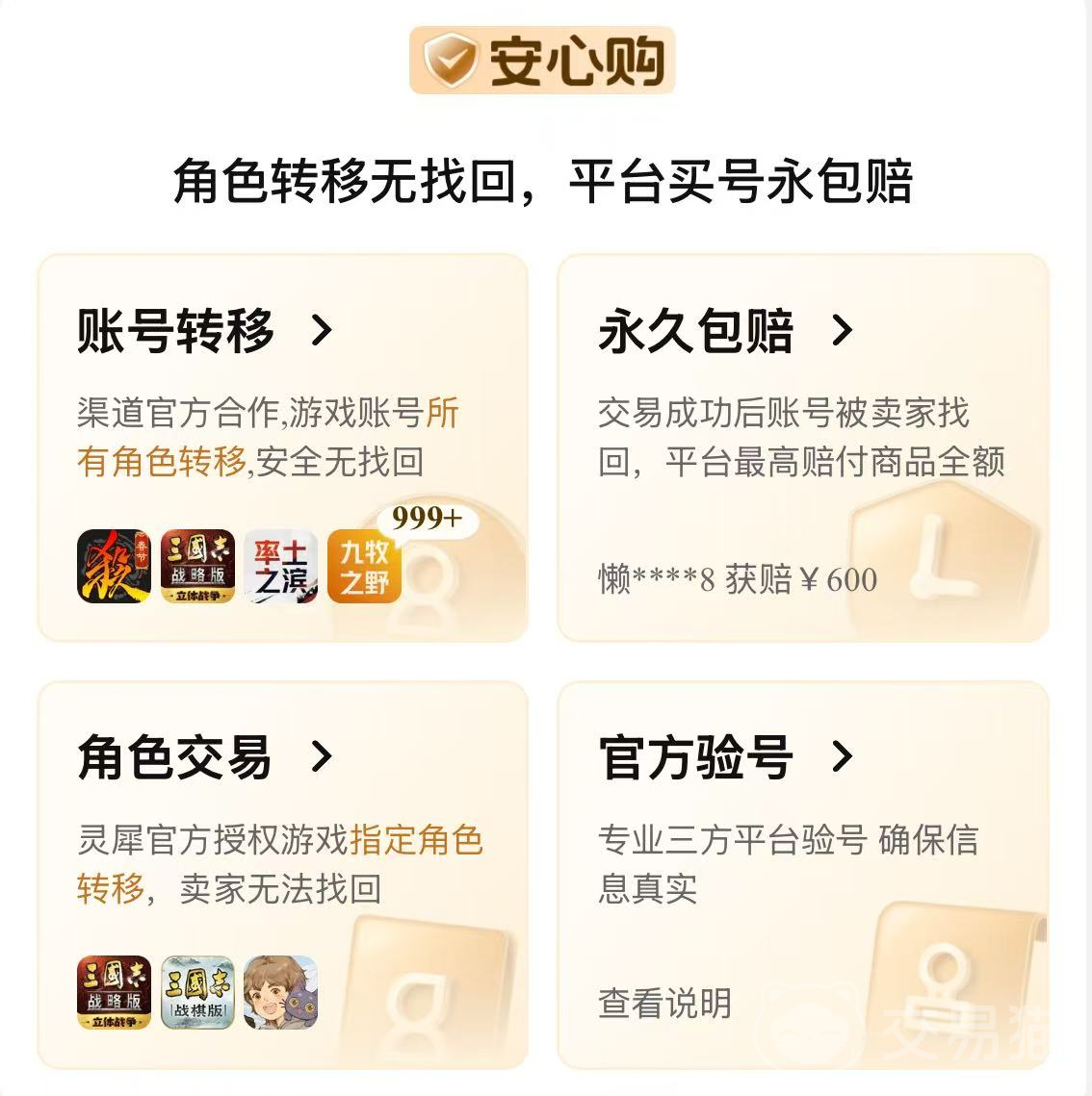 那么它是怎么构筑安全交易体系的呢?在售前的时候平台就已经通过实人验证来确保卖家为真人,一旦出现交易问题能精准溯源卖家。其次就是它支持官方验号,每一份验号报告都是独一无二的,从根源上杜绝了挂羊头卖狗肉的阴阳号,买家查看验号报告就能了解账号详情,图文绝对真实。更绝的是全场成品号都享受永久包赔,无论账号入手多长时间,只要发生找回,就能向平台来申请理赔。