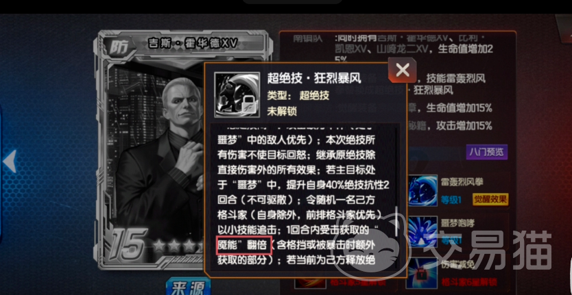 另一超绝技【狂烈暴风】强化反击收益:每次成功反击后,额外获得等量怒气点数(即双倍获取);被其“被刺”技能命中的目标无法恢复怒气值。该技能整合了原绝技除基础伤害外的所有增益效果;若主攻击目标处于“噩梦”状态,则吉斯自身绝技抗性提升40%,持续2回合。