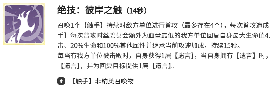 绝技【彼岸之触】是整套技能循环中的续航支点。拥有14秒冷却时间,召唤出的触手可继承施法者80%攻击力、100%其他属性及20%最大生命值。持续15秒期间,触手将持续攻击敌人,每次造成50%魔法伤害,并为我方当前生命比例最低的单位恢复其最大生命值4.1%。若存在队友阵亡,该技能将触发“遗言陈述”机制,使触手攻击所附带的治疗效果自动转移至受治疗目标身上。