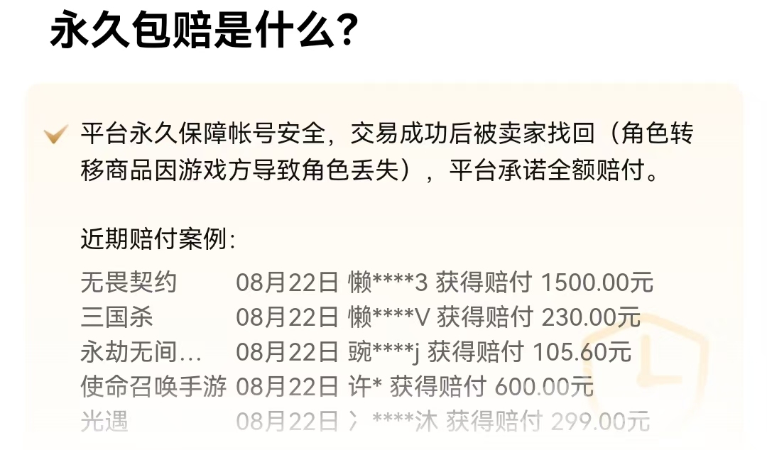 还有永久包赔这个保障,让玩家们的安全感慢慢的。玩家们最但有的就是还没有玩几天的账号,就被原账号的主人收回,但在用户们可以大大放心,只要是符合条件的订单,账号一旦出现被找回、封禁这些意外情况,平台都会负责到底。核实清楚后就能申请赔付,最高能拿到全额赔偿,相当于给账号上了份终身保险,买得放心,玩得也安心。这里小编要提醒大家选择有”永久包赔“这项服务的商品购买。