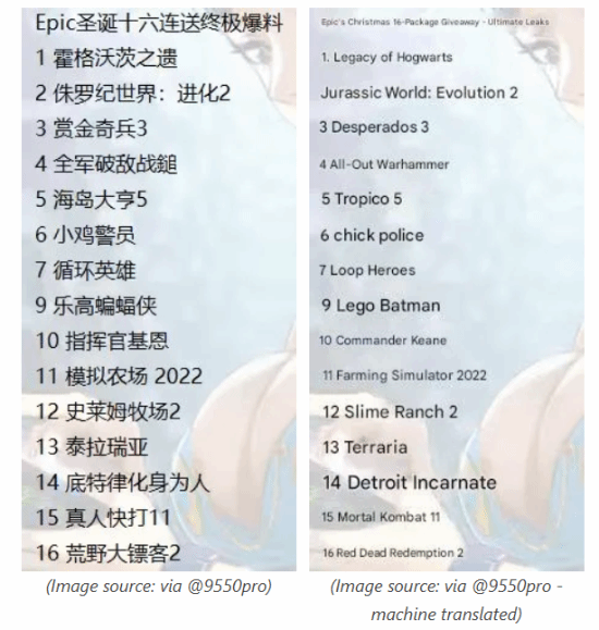 据外媒notebookcheck消息,近日,来自国内的消息源曝光了Epic连送活动的所有神秘游戏。截图显示:其它免费赠送游戏包括《侏罗纪世界:进化2》《赏金奇兵3》《海岛大亨5》《循环英雄》《小鸡警员》《乐高蝙蝠侠》《指挥官基恩》《泰拉瑞亚》《底特律变人》《真人快打11》《史莱姆牧场2》《模拟农场2022》《全面战争:战锤》《荒野大镖客救赎2》。截至目前,尚无法核实该图片的真实性。建议大家保持一定的理性和谨慎。此外需要注意的是,其中部分游戏此前已经免费送过,例如,Epic在7个月前就曾赠送过《侏罗纪世界:进化2》。