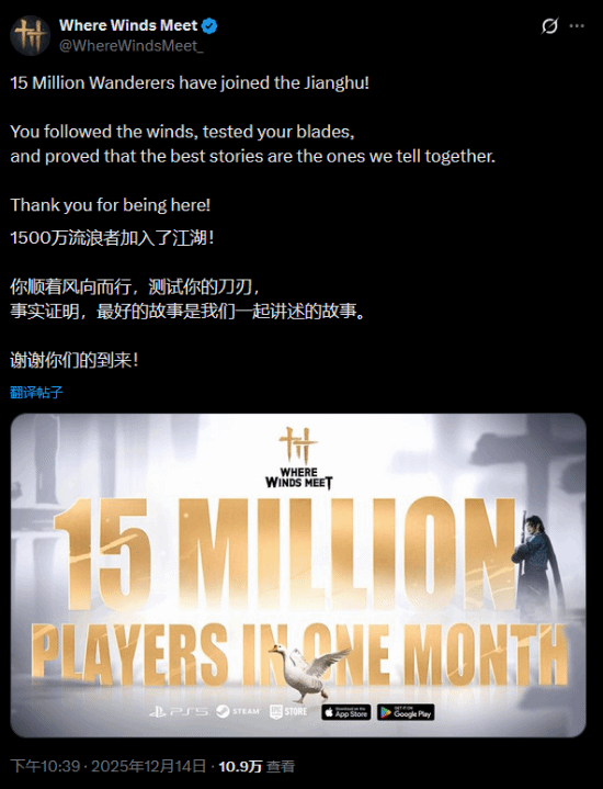 昨晚,《燕云十六声》官推宣布,自2025年11月15日国际服上线以来,游戏已经吸引1500万名玩家加入,用时仅一个月。