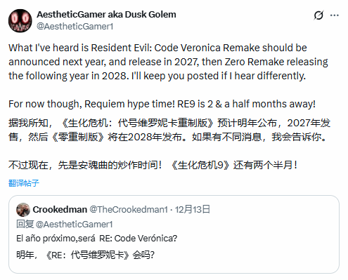 《生化危机:代号维罗妮卡 重制版》(Resident Evil: Code Veronica Remake): 预计将在明年(2026年)正式公布,并计划于2027年发售。