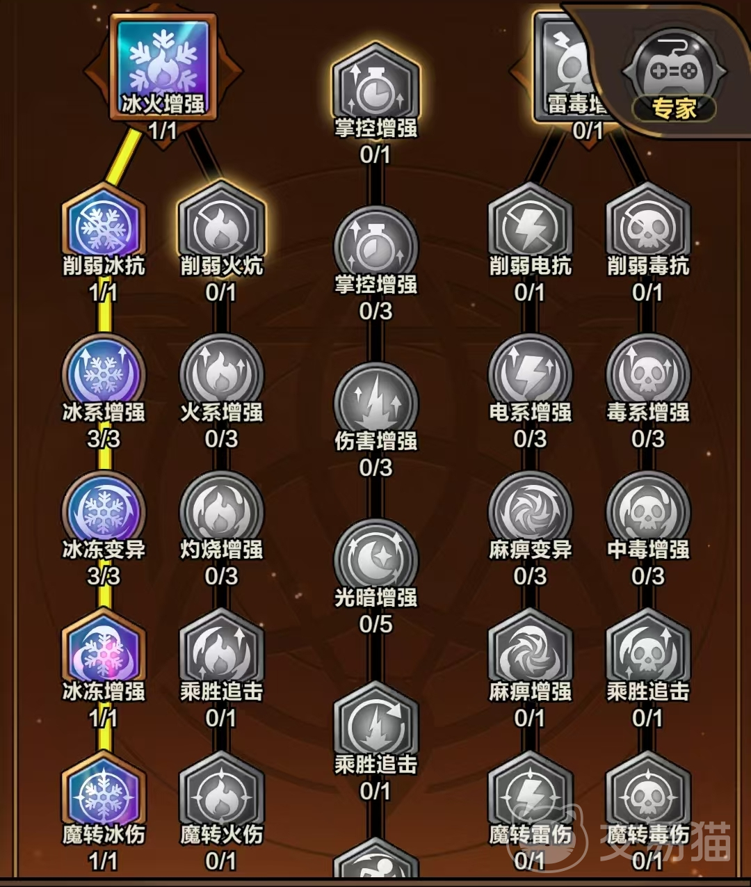 火、电、毒、冰四系玩家需激活对应元素分支中的增伤与特效强化节点;光、暗、魔法弹三类技能使用者仅需贯通**列天赋,该路径提供跨元素通用的施法速度、暴击率与能量转化率加成。本模块完成后,立即返回【防御专精】补全白色区域,剩余点数可根据实战反馈自由调配。