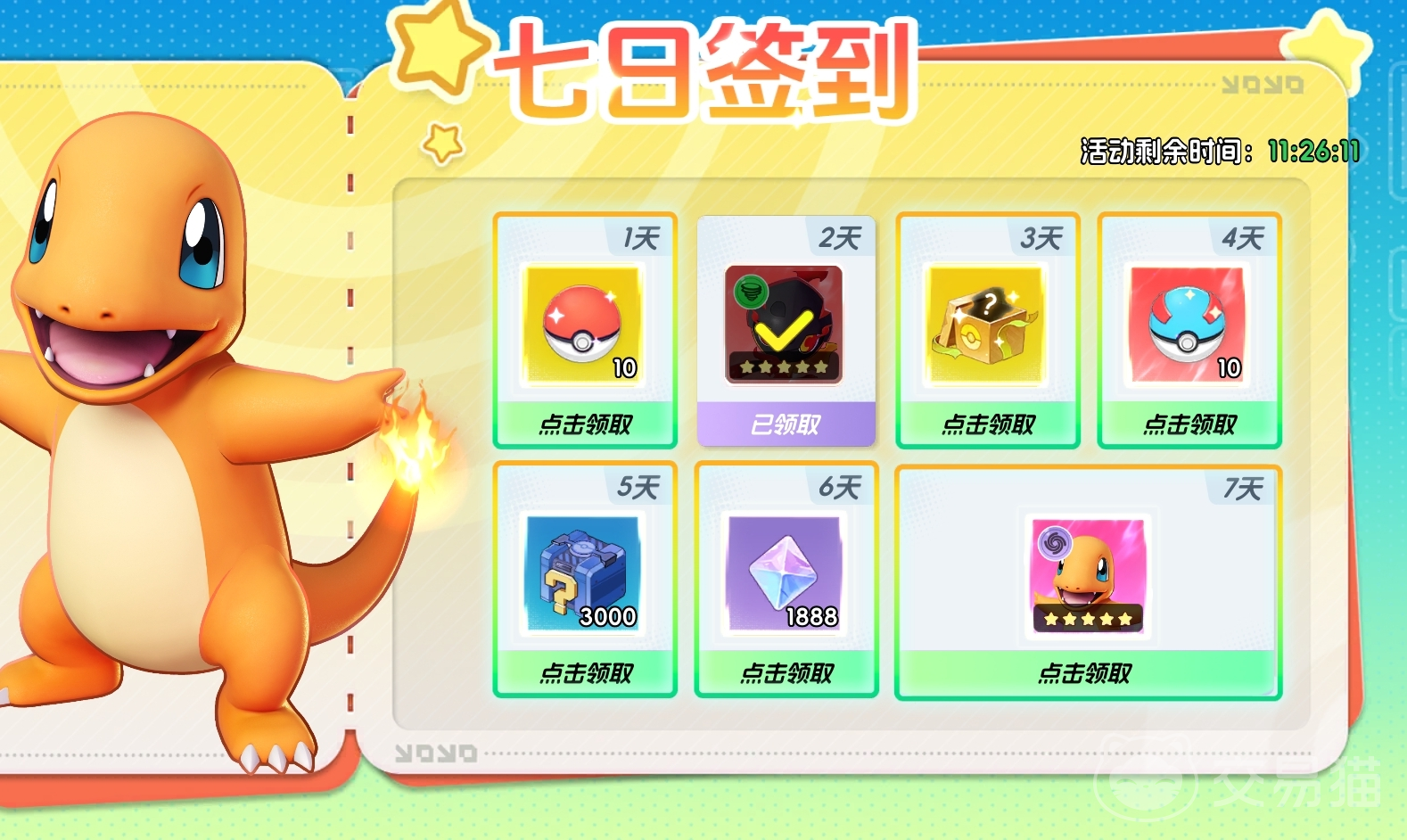 七日签到:第2日领取【炭小侍】,第7日领取SP【小火龙】。