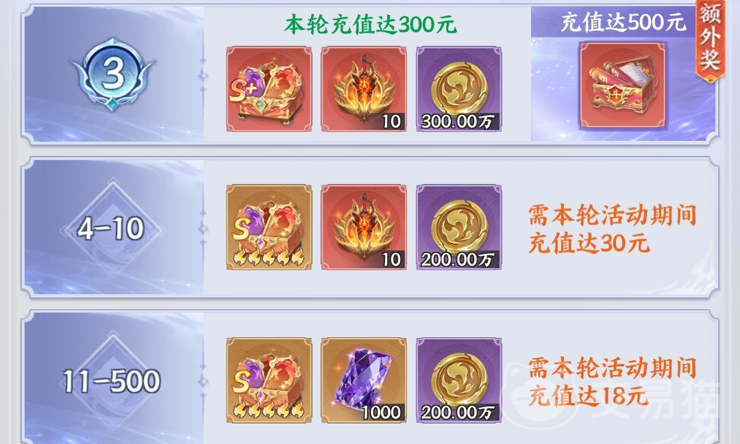 活动期间累计充值满18元即可参与排行榜争夺,进入前500名即可获得对应排名奖励,名次越靠前,奖励越丰厚。
