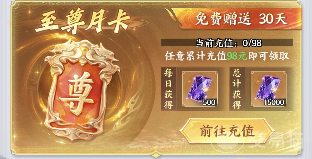 累计充值达98元后激活,有效期30天,每日发放500张【紫晶卡】,总计15000张。建议同步开通招募特权与修炼特权以完整激活权益。