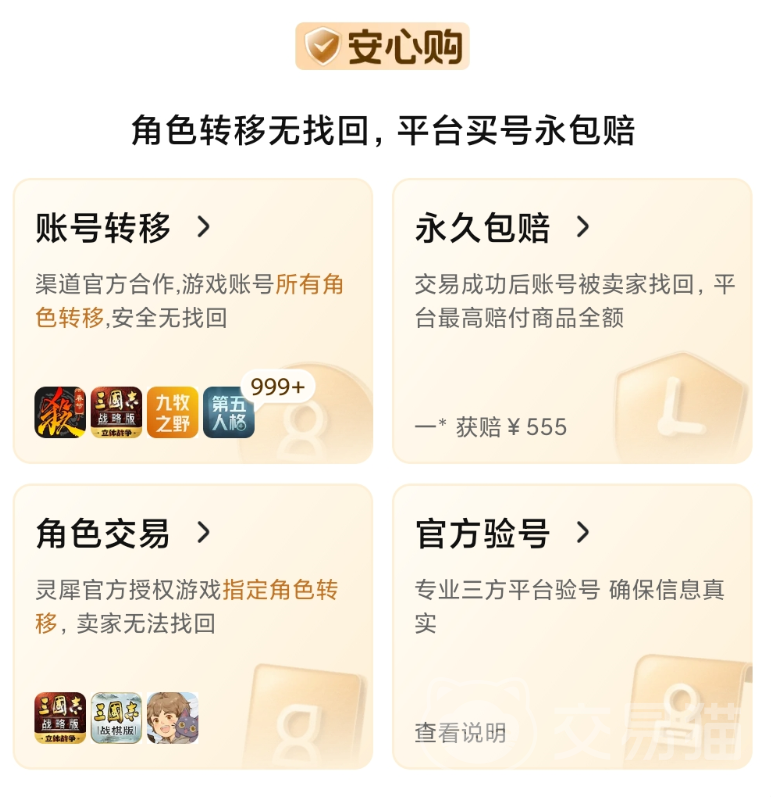 内的“安心购”不是一项需要购买的服务,进入平台就直接公示在主页,也是平台对于安全的一大王牌,只要是在此购买的成品号都不用担心被找回的问题,24小时客服快速响应解决问题,假设真的被找回了,自带的包赔服务核查之后会立刻生效,先给买家打款之后再去解决后面的问题。