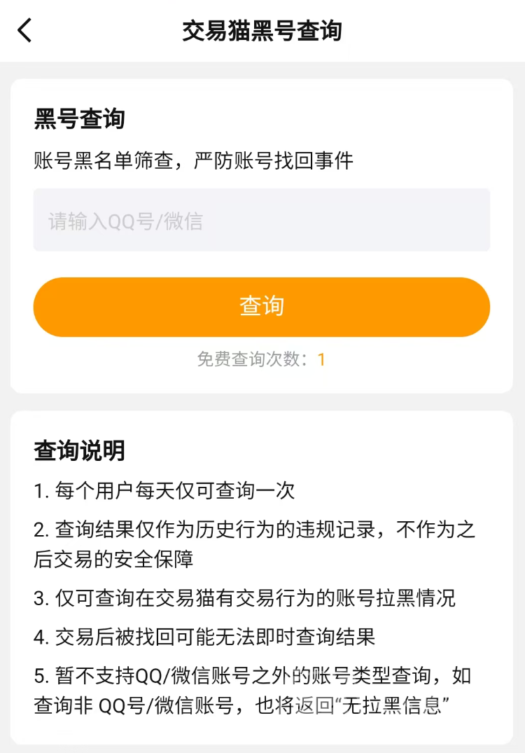 如果有的商家恶意“倒号”或是出售违规账号,在主页的“安全中心”能进行黑号查询,也就是通过输入卖家提供的账号信息,就能快速检索该账号在平台中是否存在违规信息,如有违规信息的话将会显示“被拉黑”,此时直接选择规避就可以,在安全中心内也宣扬了许多有关账号交易的安全知识和常见骗术,从而为每个人去敲响警钟。