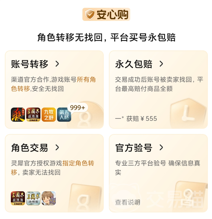 以上就是安全的神武手游交易平台官网是什么全部内容,不断升级、强化,都在努力保护交易双方的权益,对买家来说光是看口碑都会觉得很放心,但它们依然在多方面强化了安全系统。