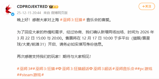 今天晚上,CDPR官方微博发文宣布:晚上好!感谢大家对上海《巫师3:狂猎》音乐会的喜爱。为了回应大家的热情和需求,经过协商,我们确认新增两场加场,时间为2026年3月22日15:00与20:00!