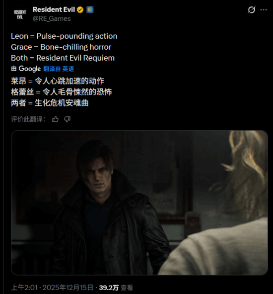 今天早上,卡普空官方在推特发文介绍了《生化危机9》中两位主角的玩法侧重点。简单来说,女主格蕾丝倾向于令人毛骨悚然的恐怖游戏体验,而里昂则更加注重“令人心跳加速的动作”玩法,两者加起来就是《生化危机9:安魂曲》!