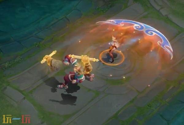 被动技能:能量满蓄,盘古身后凌空幻化出一双手持英歌槌的巨臂。每次敲击皆伴随纹样与火焰飞旋而出。