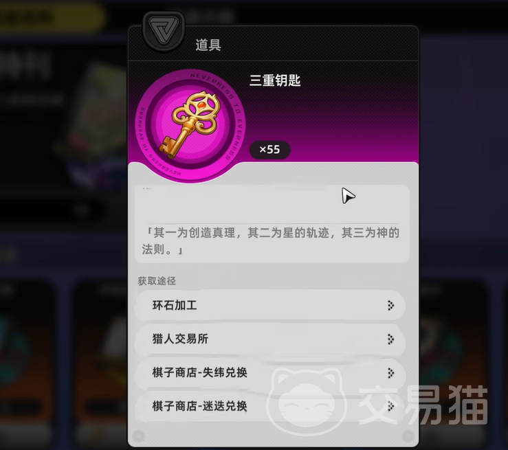 第一类为环石加工:消耗160枚环石兑换1把三重钥匙。环石属高稀缺性通用资源,主要服务于限定角色抽取,该兑换方案资源转化率偏低,仅建议资源极度充裕的玩家酌情采用。