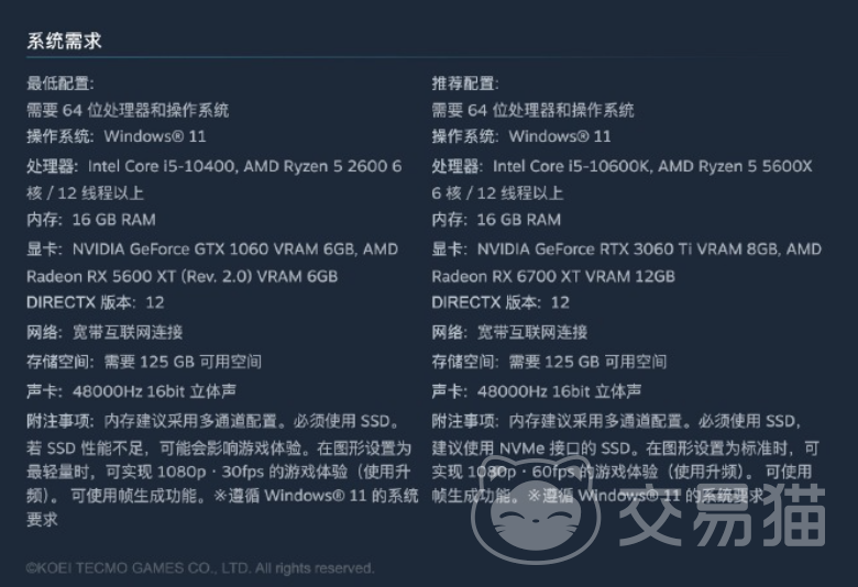根据开发团队公布的系统规格,《仁王3》对运行环境有明确下限:操作系统必须为Windows 11或更高版本;CPU最低需搭载Intel Core i5-10400;内存不得低于16GB;显卡方面,GTX 1060为可满足基础运行的最低型号;此外,本地安装空间需预留约125GB,以确保完整游戏资源顺利载入。