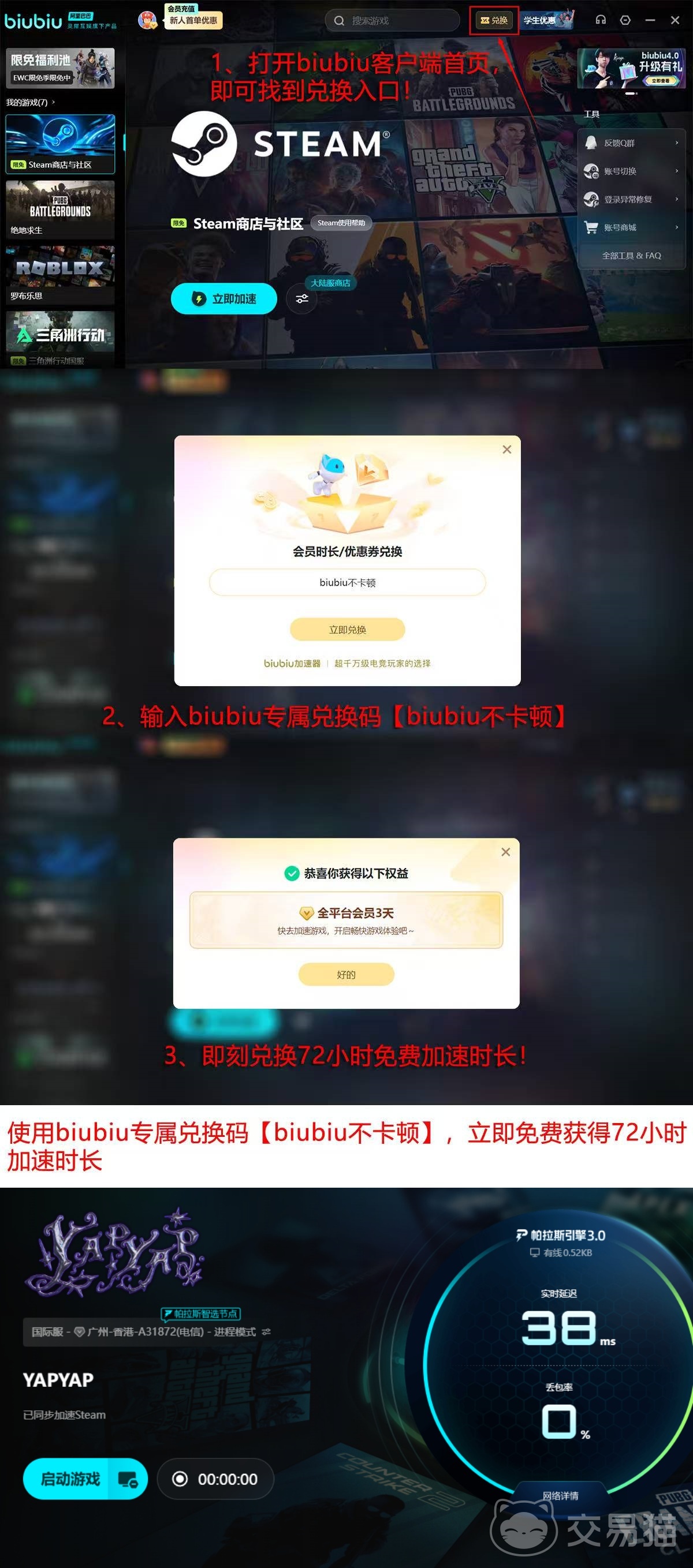 针对新用户,现开放限时体验通道:注册即赠24小时加速服务时长;另附“biubiu不卡顿”专属兑换码,可额外领取3天免费使用权,总计可达4天完整试用周期,便于充分评估网络表现与游戏适配效果。