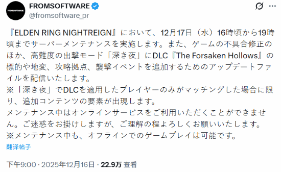 今晚,《艾尔登法环:黑夜君临》官方发布服务器维护公告,除了修复游戏问题外,还有深夜模式新增内容。