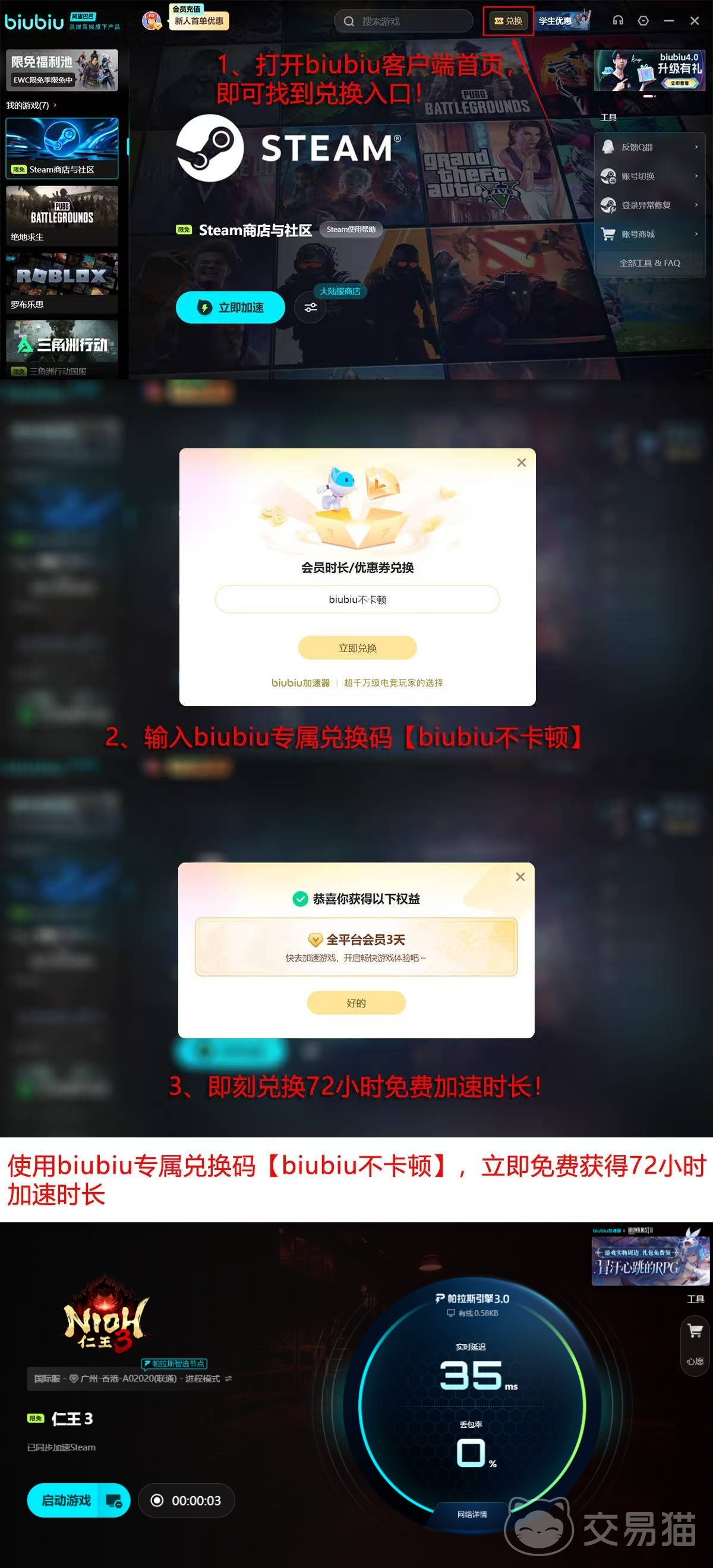 新用户完成注册并登录后,即可领取24小时免费加速时长;另可通过兑换码【biubiu不卡顿】额外获取72小时服务。两项叠加,单个新账号最高可享96小时连续加速权益,充分覆盖多轮Boss攻坚与装备打磨周期。