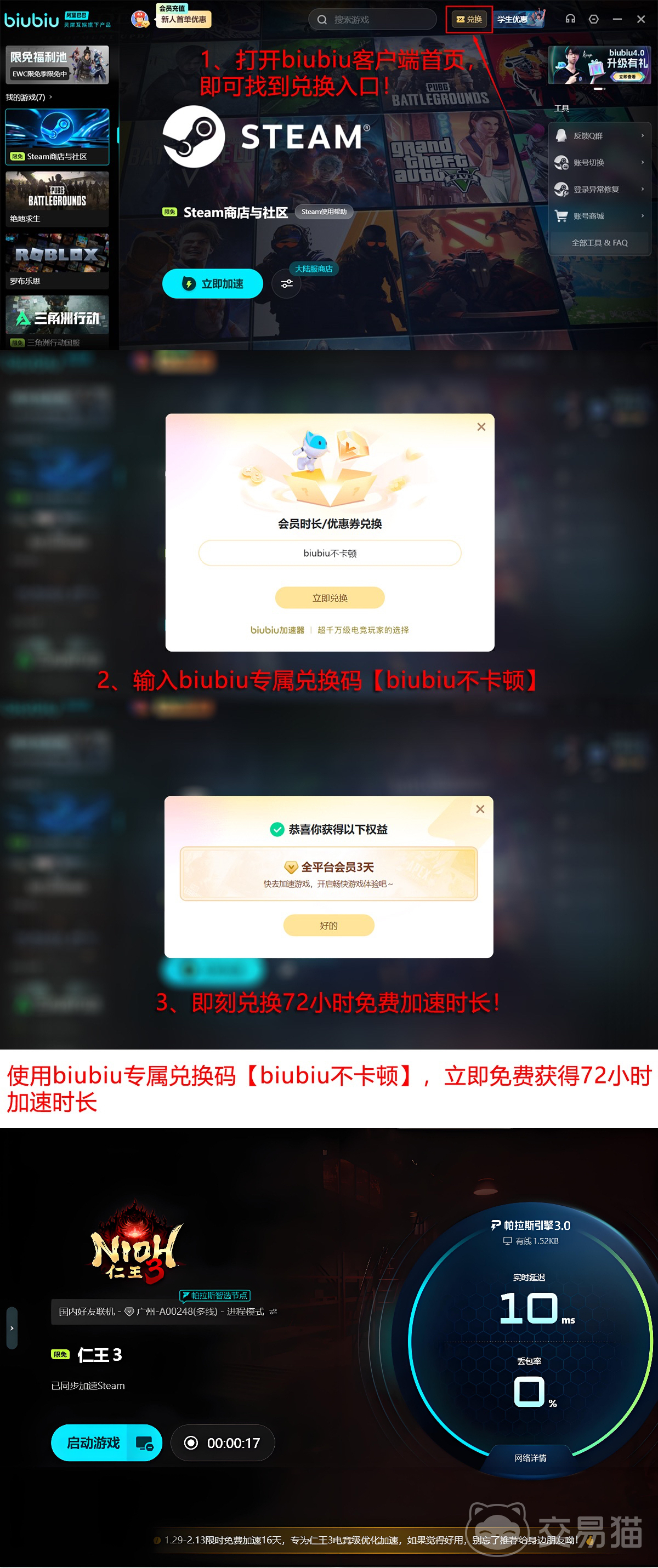 当前biubiu加速器面向全量用户开放限时福利:输入兑换码【biubiu不卡顿】,即可立即领取72小时免费加速时长;新用户完成注册后额外获赠24小时,累计达96小时,足以覆盖多轮联机刷本、Boss攻坚及跨区协作需求,全程保持低延迟、高稳定性连接表现。