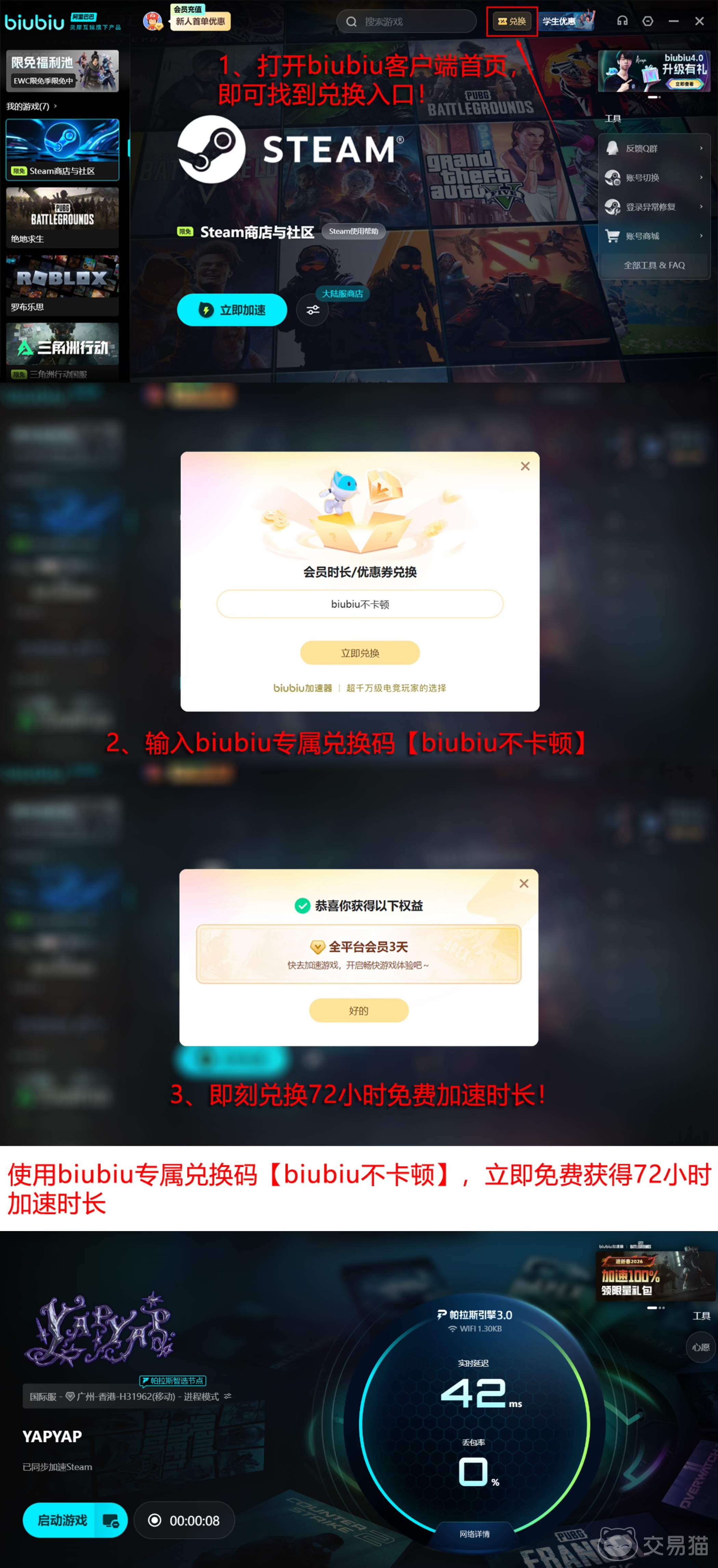 除技术优势外,该工具同步推出限时福利政策:所有注册用户输入口令【biubiu不卡顿】即可领取3天全功能免费加速权限;新注册用户还可额外叠加24小时专属新人加速时长。上述权益仅限首次兑换,不可重复领取。