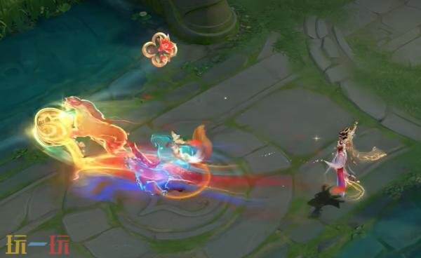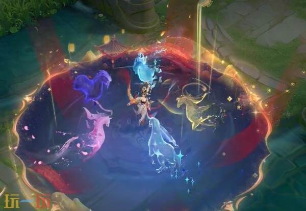 * 三技能:貂蝉翩然起舞,石榴花在红绸的环绕中绽放。五匹队友的神骥踏着丝绸从四面而来,随着朱幔降落,宴饮幻景显现。杯盏悬空,将琼浆玉露倾泻而下,映照出山河万里图。神骥奔腾环绕,欢宴正酣,杯盏莫停。