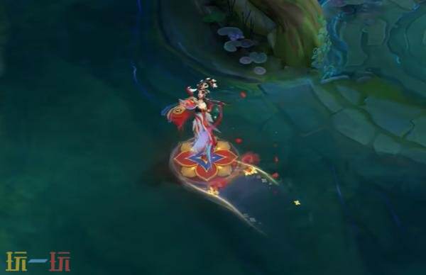 貂蝉踏着石榴花幻化而成的载具,起舞前行