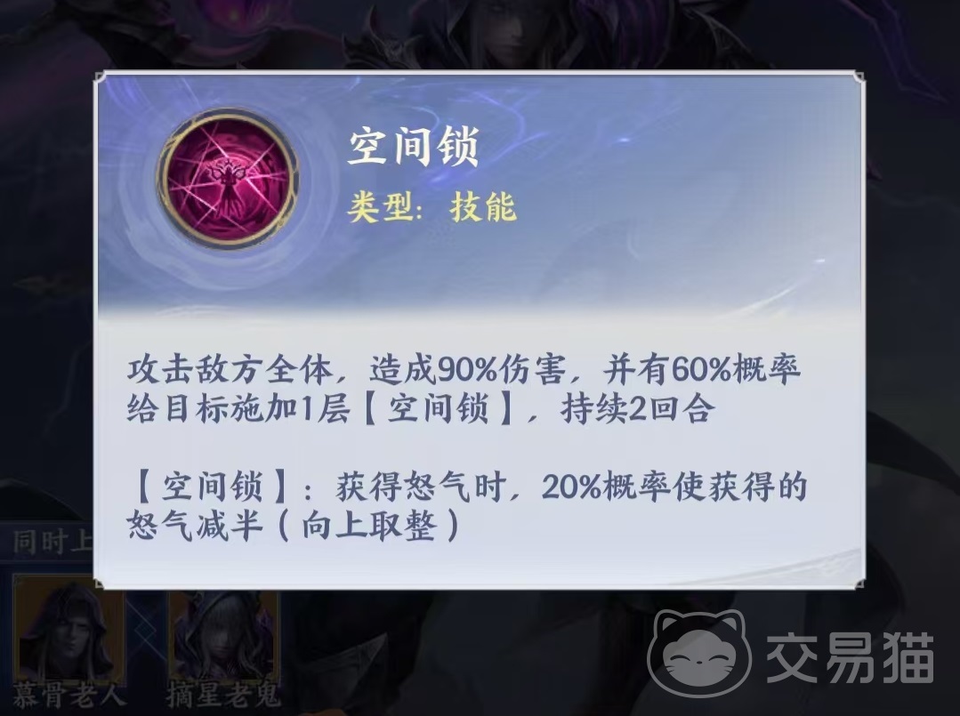 摘星老鬼拥有专属属性“水”,战力评级为当前版本最高档位S 。其协同机制明确:与慕骨老人共同登场时,全队可获得15%额外防御加成。核心技能“空间锁”为全体攻击技,命中后必施加一层持续两回合的空间锁状态;该状态生效期间,敌方每次获取怒气均有概率减半——此为打断节奏、延缓大招释放的核心限制逻辑。