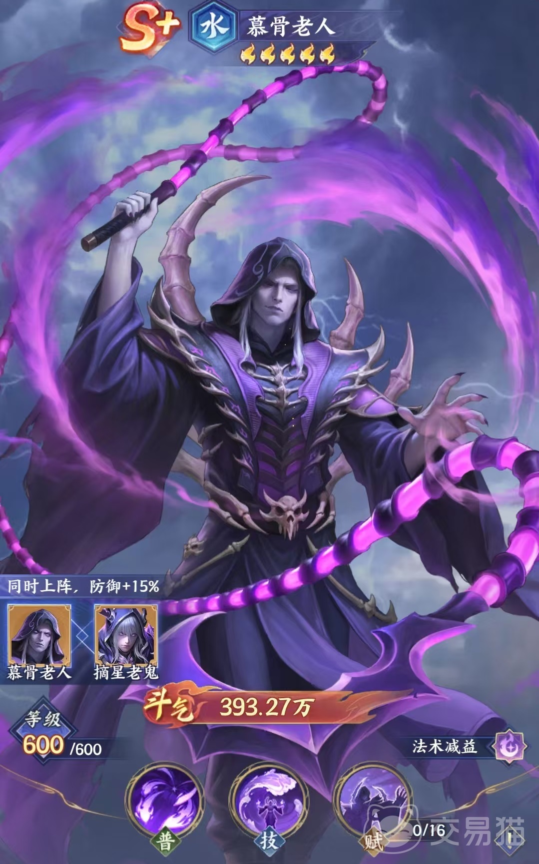 今天为大家深度解析《斗破苍穹》手游中极具战略价值的水系S 级斗者——摘星老鬼。该角色虽在原著中以诡谲莫测著称,在游戏中则被精准定位为高阶法术控制型核心,其机制设计兼顾群体压制与怒气干扰,是中后期阵容构建的关键支点。