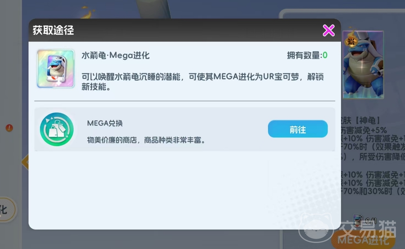 获取流程清晰明确:玩家需先获得月亮1阶的杰尼龟,随后累计完成16次升阶以解锁MEGA进化权限。接着通过MEGA兑换系统获取水箭龟专属MEGA进化卡,消耗1张即可完成首次进化,使其晋升为UR品质的超级水箭龟。后续如需达成五阶MEGA上限,仍需持续兑换对应进化卡并完成进阶操作。