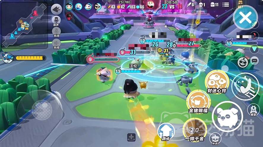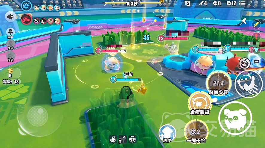 二技能“金猪赐福”可为目标友方施加护盾与移速增益,并在短暂延迟后于其周围触发范围爆炸,造成伤害与减速,适用于关键队友保命、突进或撤退场景。