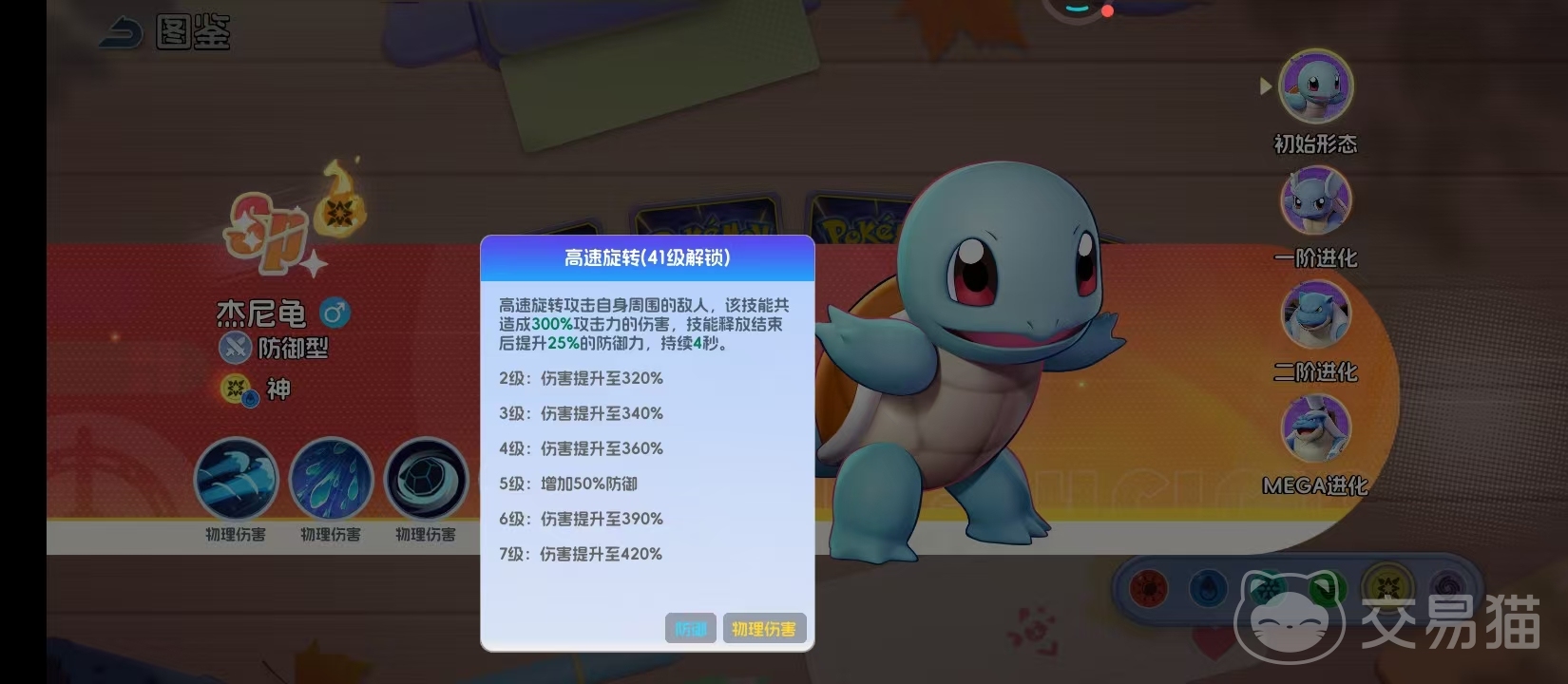 高速旋转在41级开放,是体现杰尼龟防御定位的核心技能。以自身为中心高速旋转,造成300%攻击力的范围伤害;技能结束后立即提升25%基础防御力,5级效果进一步增强至50%,持续4秒。该增益显著强化其近身缠斗能力,使其在切入敌方后排、限制敌方输出时具备更强生存资本,成为PVP环境中破阵的关键支点。