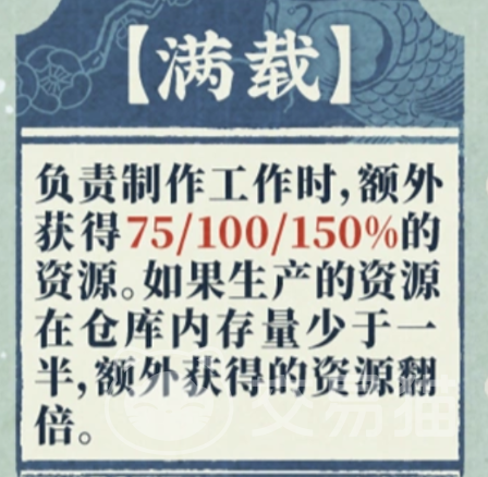 钟雪渔拥有两项专属技能:“满载”与“渔利”。其中,“满载”可在执行制作类工作时,依据技能等级额外产出75%、100%或150%的基础资源;若所产资源在仓库中存量低于总量一半,则该加成效果直接翻倍。