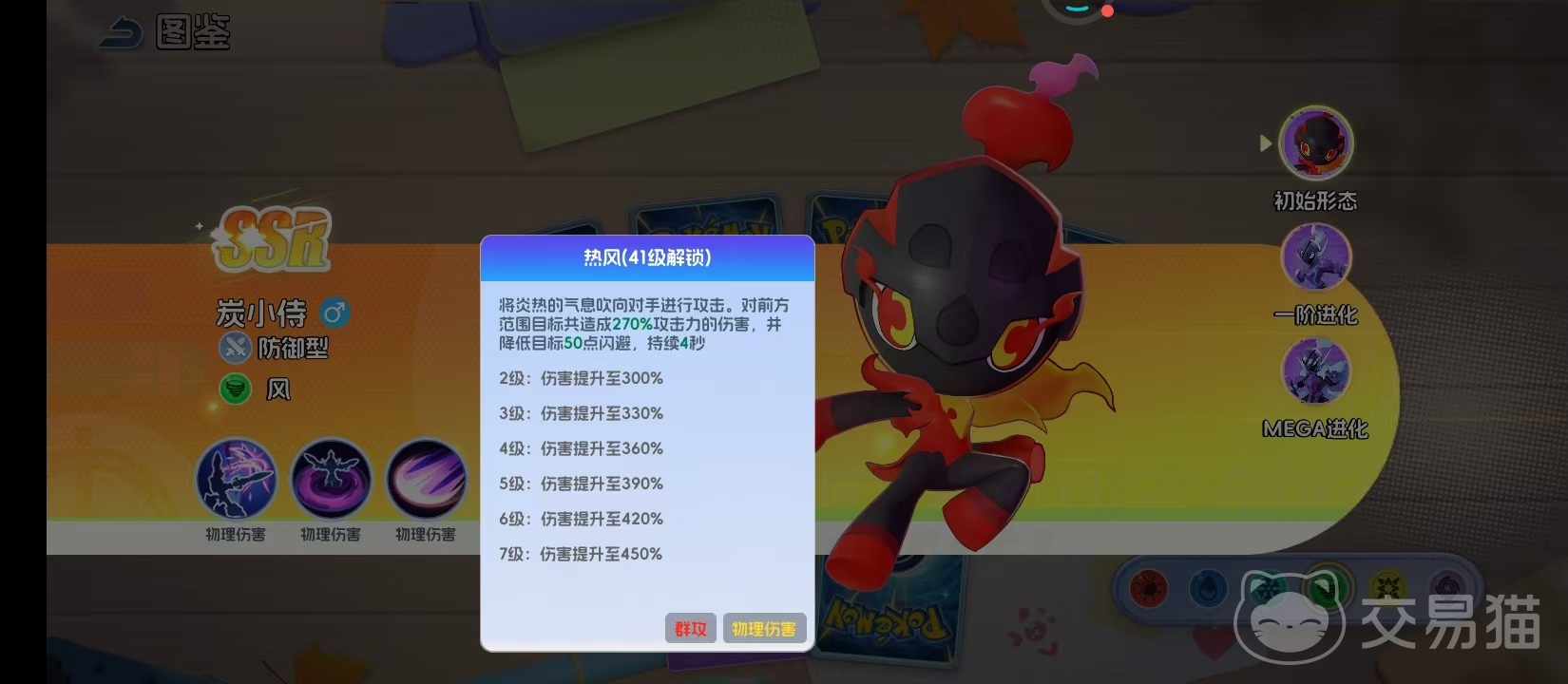 【热风】在41级开放,是具备功能性干预价值的战术技能。向前方锥形区域喷吐炽热气流,造成最高450%攻击力伤害的同时,降低目标50点闪避属性。该效果并非单纯增伤,而是精准针对高机动、高闪避类角色(如部分刺客型宝可梦),大幅削弱其生存容错率,提升己方核心输出技能命中率,在对抗灵活阵容时具有不可替代的战略意义。