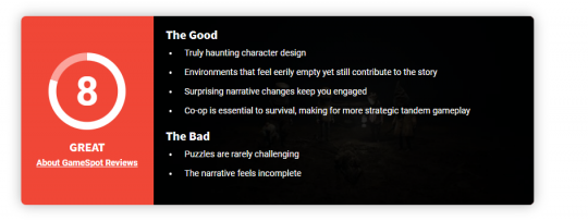 目前,该游戏媒体评分正式解禁,M站PC版均分高达98分,其中外媒gamingbolt为本作给出了9分的好评,而媒体Gamespot给出了8分好评,一起来看看吧!
