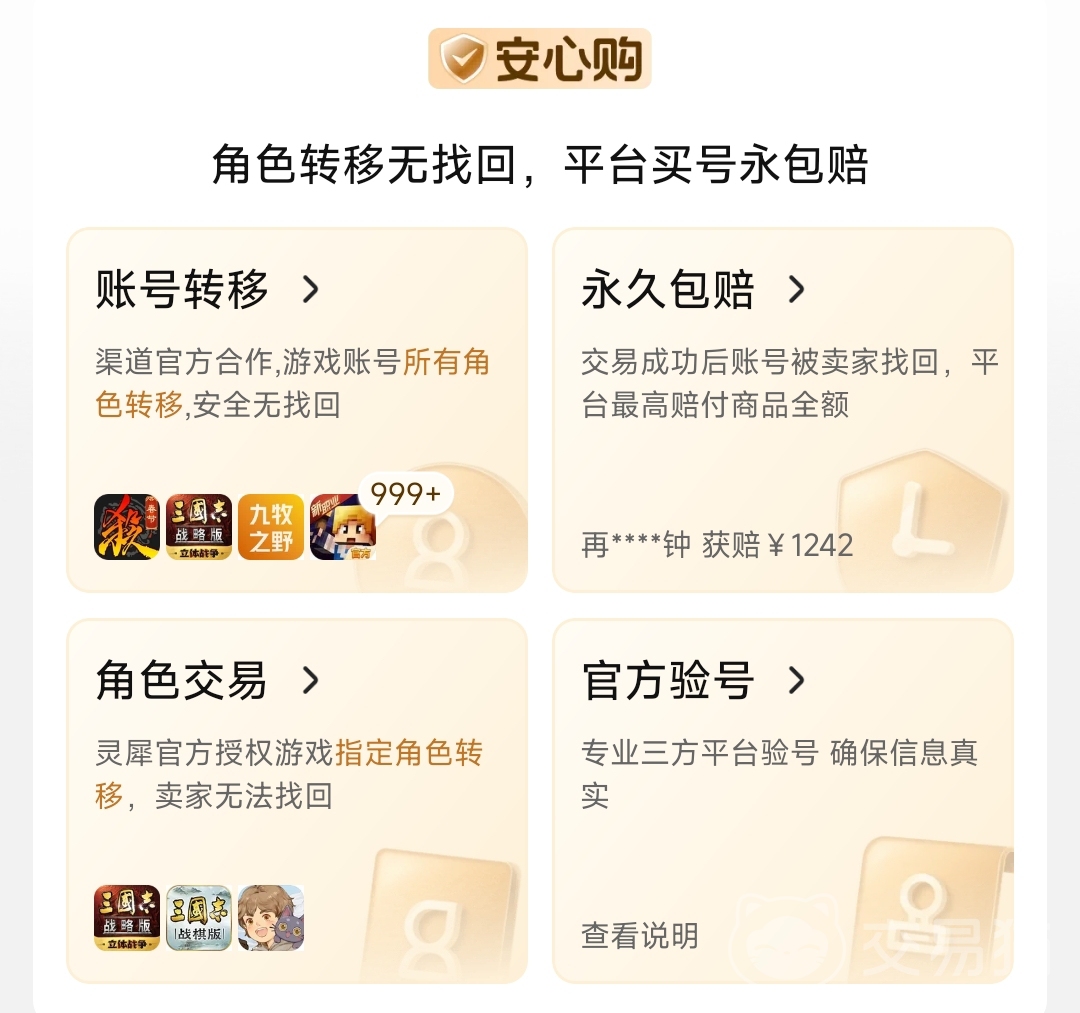 在上还有很多的服务内容,能很好的维护买卖双方的利益,比如说的特色【安心购】服务,为卖家提供了官方验号服务、永久包赔服务、自动发货等多个内容。同时在安全中心也有很多反**知识,建议好好学习下,反诈意识的提高对于这次交易的顺利进行也是有很大帮助的。