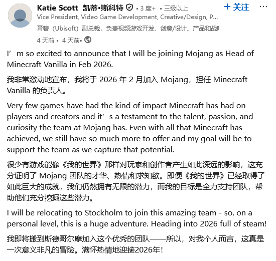 近日,育碧全球创意办公室副总裁Katie Scott在领英上宣布,她即将于2026年2月正式加入微软旗下《我的世界》的开发商Mojang,担任原版《我的世界》项目负责人。