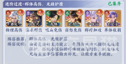 【爆发节奏流】——强调先手压制与瞬时输出 核心构成:萧炎(物理高伤)、邱尺尺(法术瞬伤)、青鳞(吸血免伤)、风清儿(窃怒免伤)、小医仙(群疗加攻)、玄重子(单体收割) 本阵容以青鳞无敌护盾为战术支点,首回合即规避敌方爆发伤害,为后续输出争取关键窗口;风清儿通过窃取敌方怒气打断其大招节奏,同步降低己方承伤;邱尺尺与萧炎构成双C结构,配合小医仙的群体攻击增益,迅速抬升整体DPS;玄重子则在残局阶段精准收割。实战中需严格把控青鳞护盾释放时机,确保覆盖敌方首轮技能峰值,再由邱尺尺与萧炎同步启动爆发链。
